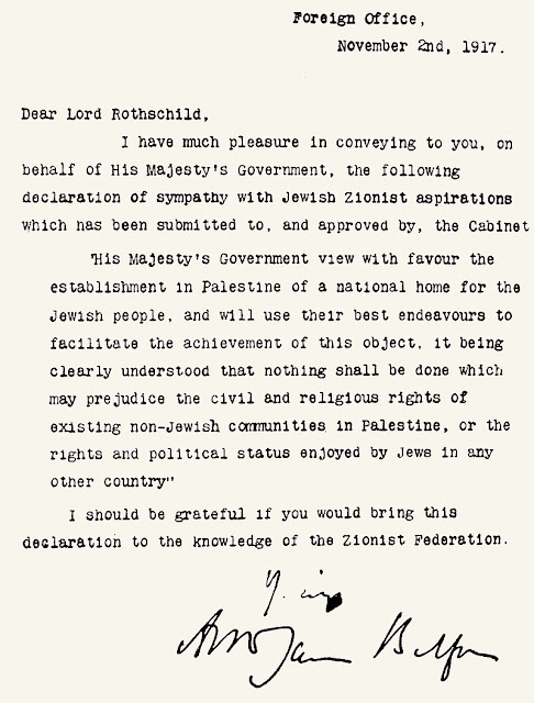 Bencana terjadi ketika Inggris menyatakan bahwa mereka telah membuka Palestina sebagai "National home for the Jewish People." Pernyataan tersebut dicantumkan dalam secarik surat dari menteri luar negeri Inggris, Sir Arthur Balfour kepada pimpinan tokoh Yahudi, Lord Lionel Walter Rothschild, seorang anggota parlemen Inggris yang merupakan orang Yahudi.